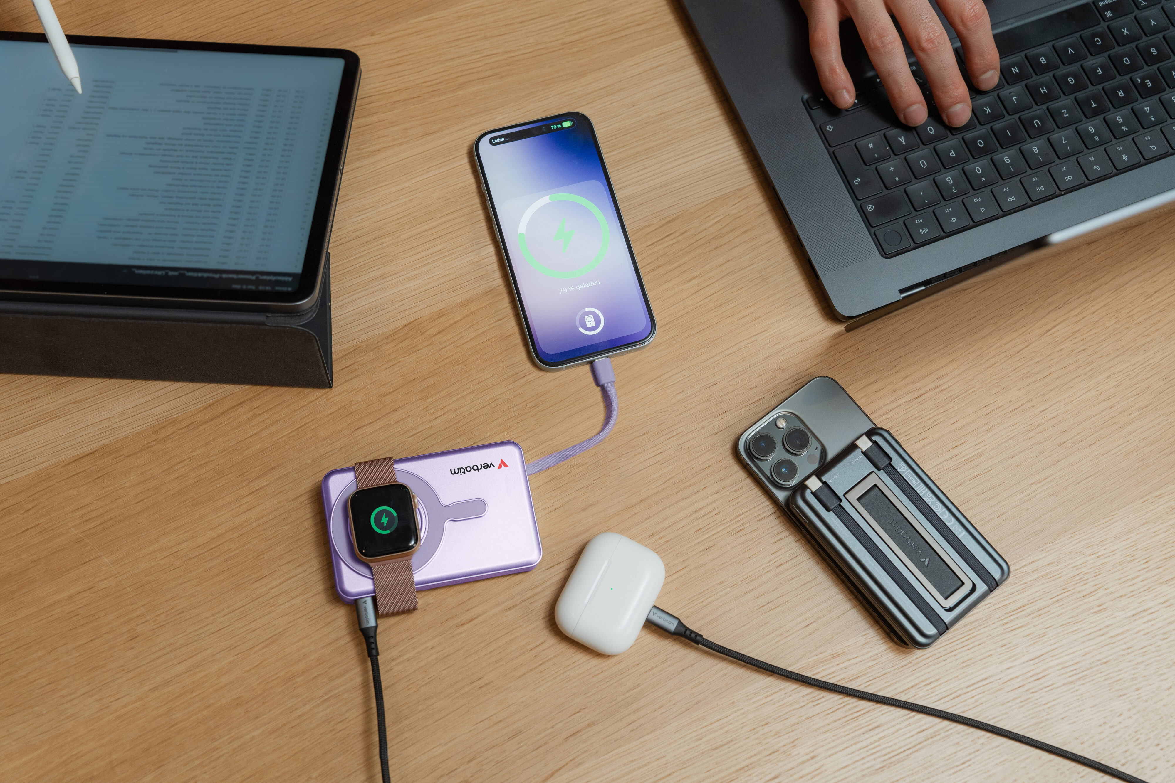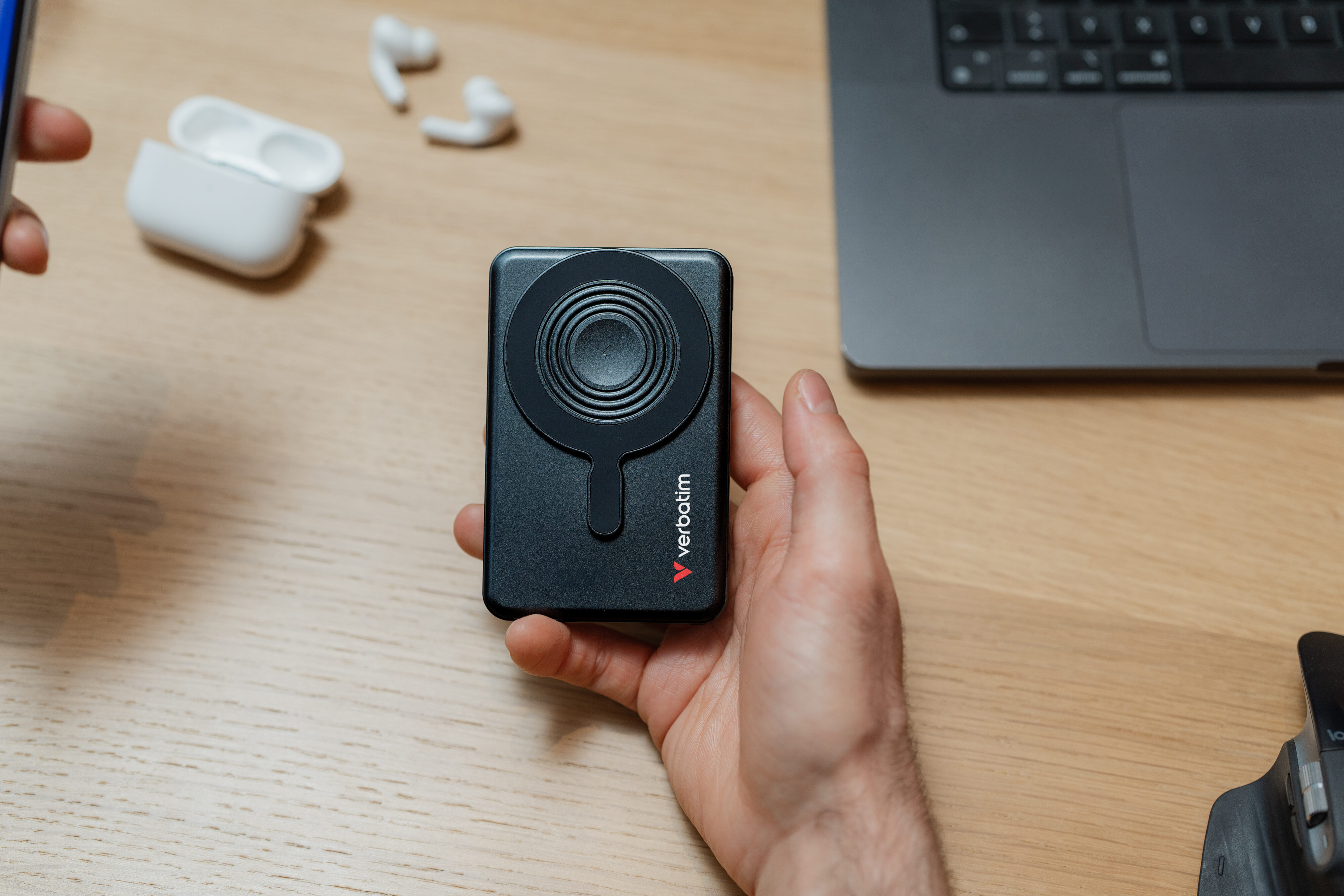 Ditch the tangled cables and enjoy seamless wireless charging with the Charge ‘n’ Go Power Bank. Equipped with magnetic alignment for MagSafe compatible devices, it delivers up to 15W for phones*, plus dedicated outputs for AirPods™ and Apple Watch™. Android users aren’t left behind – Qi-compatible wireless charging provides the same effortless experience. Charge your phone while it’s propped up on the kickstand, browse or stream, and stay fully powered without interrupting your day.