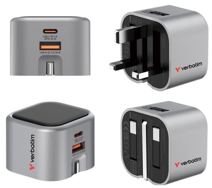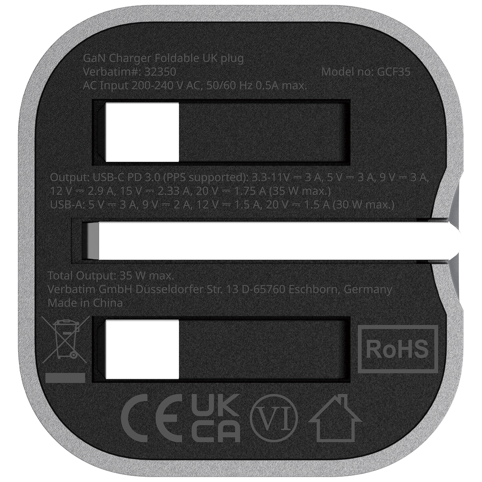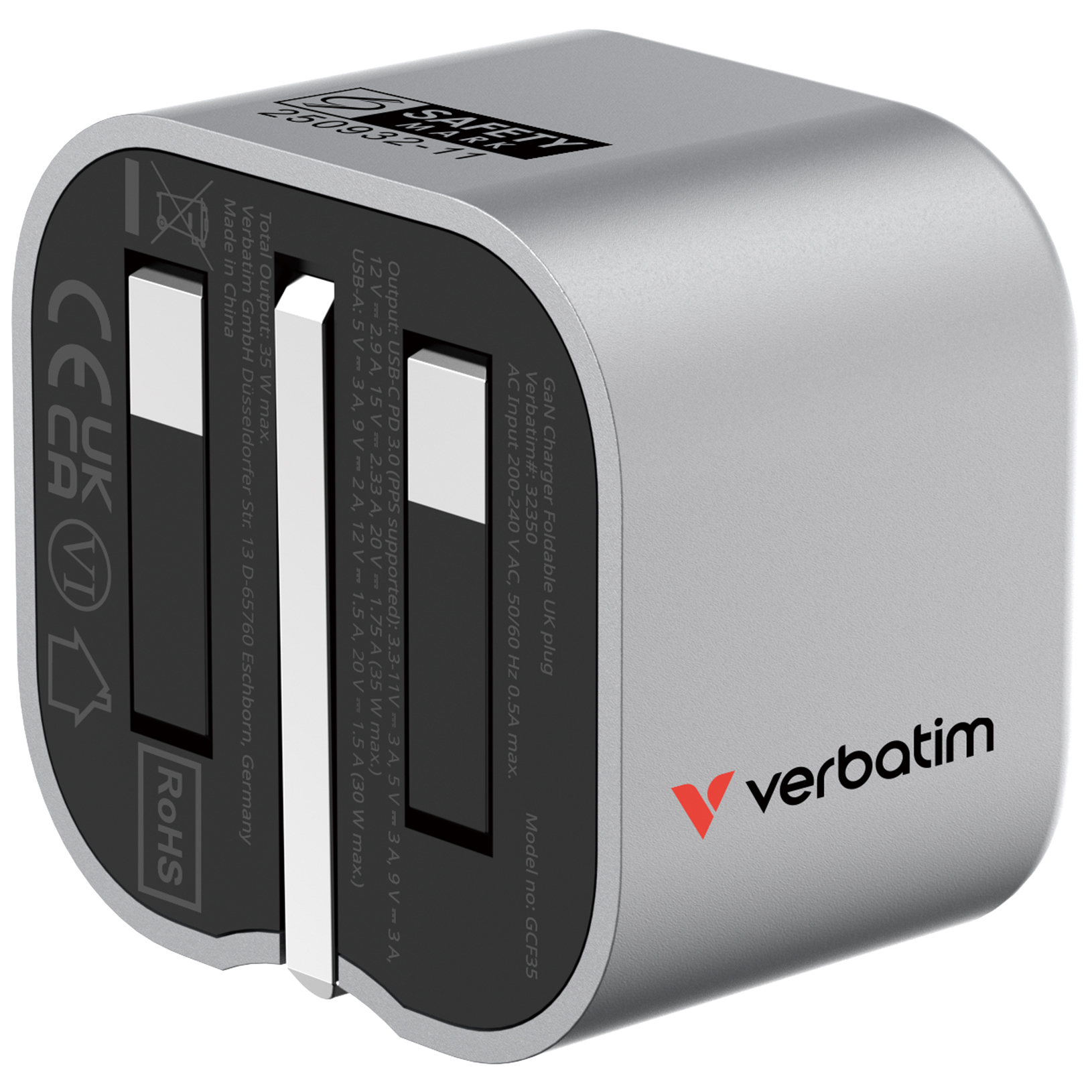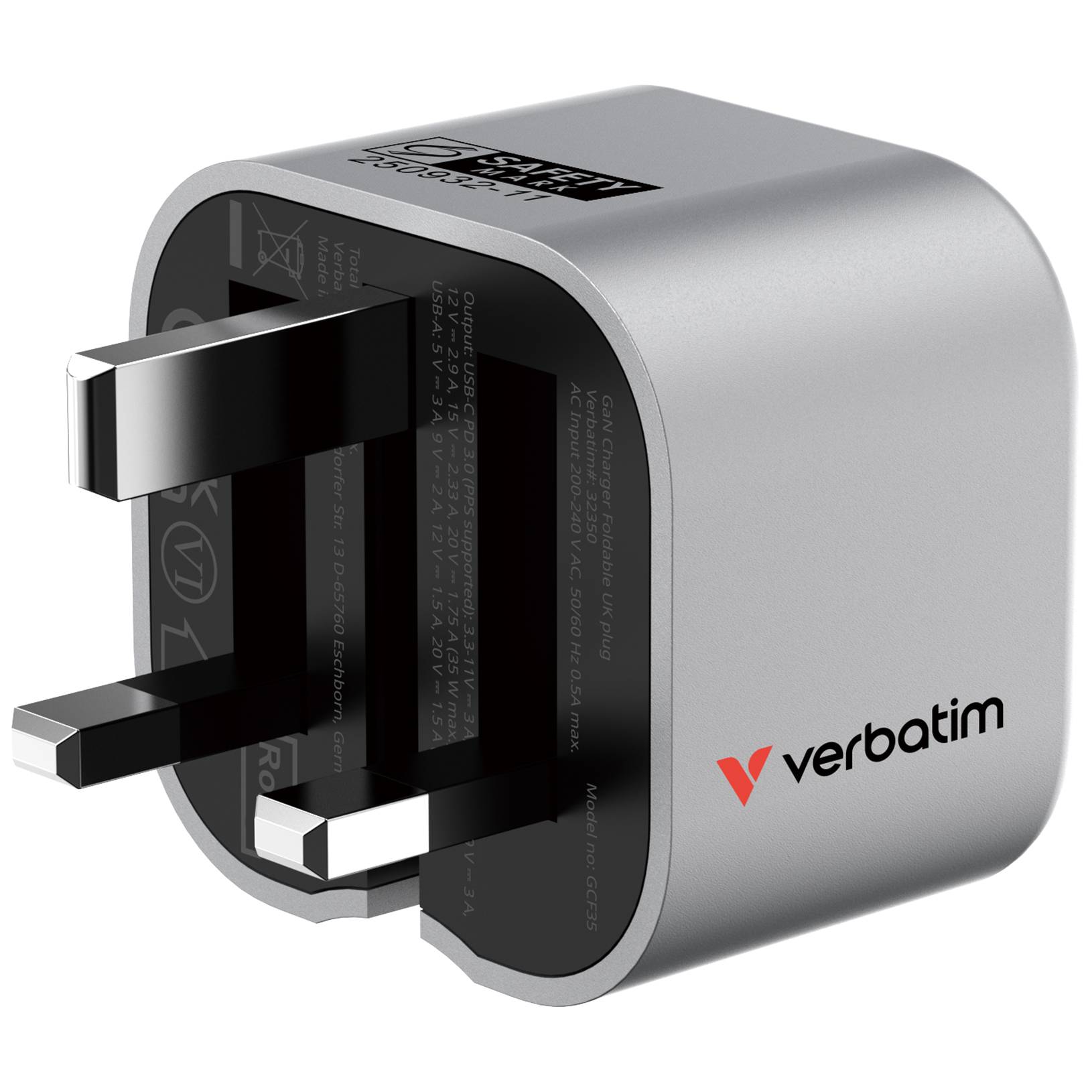 - Verbatim GaN Charger Foldable UK Plug 35W with 1 x USB-C 1 x USB-A