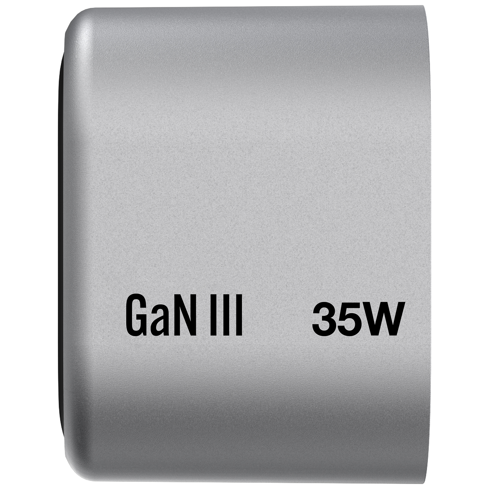Charges up to 2 devices simultaneously with a maximum total output of up to 35W. Its Gallium Nitride (GaN) material conducts electricity more efficiently and generates less heat than silicon, resulting in higher power conversion efficiency and a safer, cooler charging process that prolongs the life of the charger and connected devices.